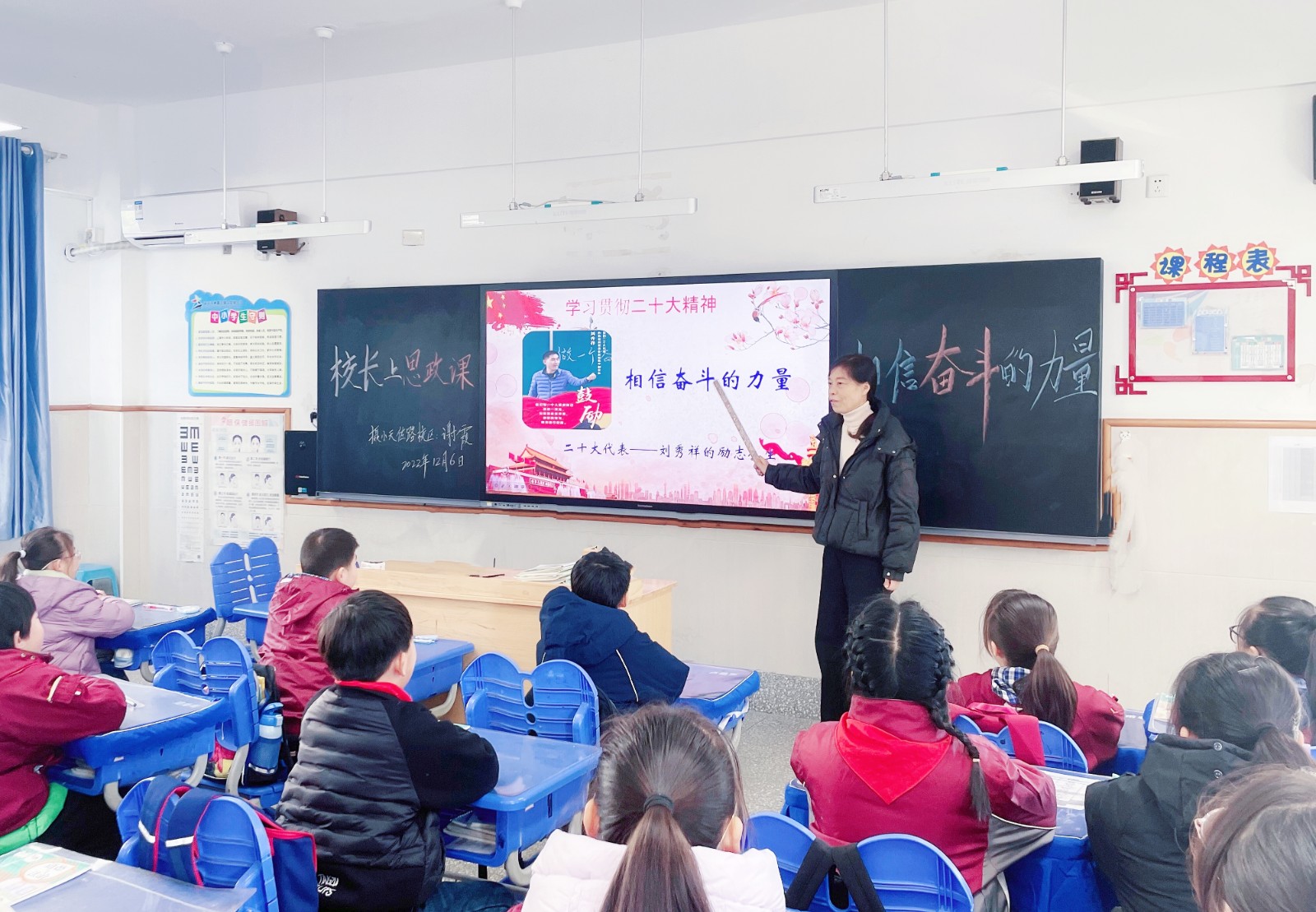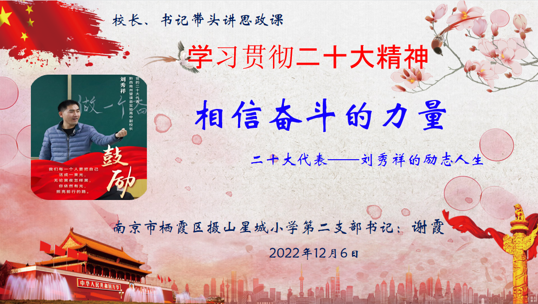 深入学习贯彻党的二十大精神,进一步推进习近平新时代中国特色社会主义思想进校园、进课堂、进头脑,弘扬主旋律,传播正能量2022126日下午,摄山星城小学第二支部书记,天佐路校区谢霞校长,给五(3)班36名学生讲了一节思政课——相信奋斗的力量!通过讲述二十大代表“刘秀祥”的励志人生,勉励同学们:要把自己活成一束光,照亮前行的道路;精彩的人生是奋斗出来的;要相信奋斗的力量!