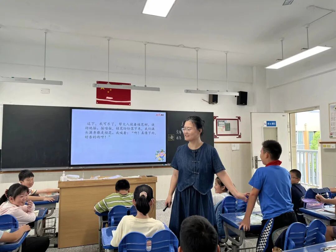 9月10日上午,陈怡冰老师带领五(2)班同学呈现了一节精彩的语文课堂。她引导学生深入文本,通过“品桂花香”“感摇花乐”“悟思乡情”“谱思乡曲”等学生活动,层层递进,将桂花芬芳与课堂氛围融合,使学生仿佛置身桂花雨中,与作者共品童年的甜蜜与乡愁的苦涩。