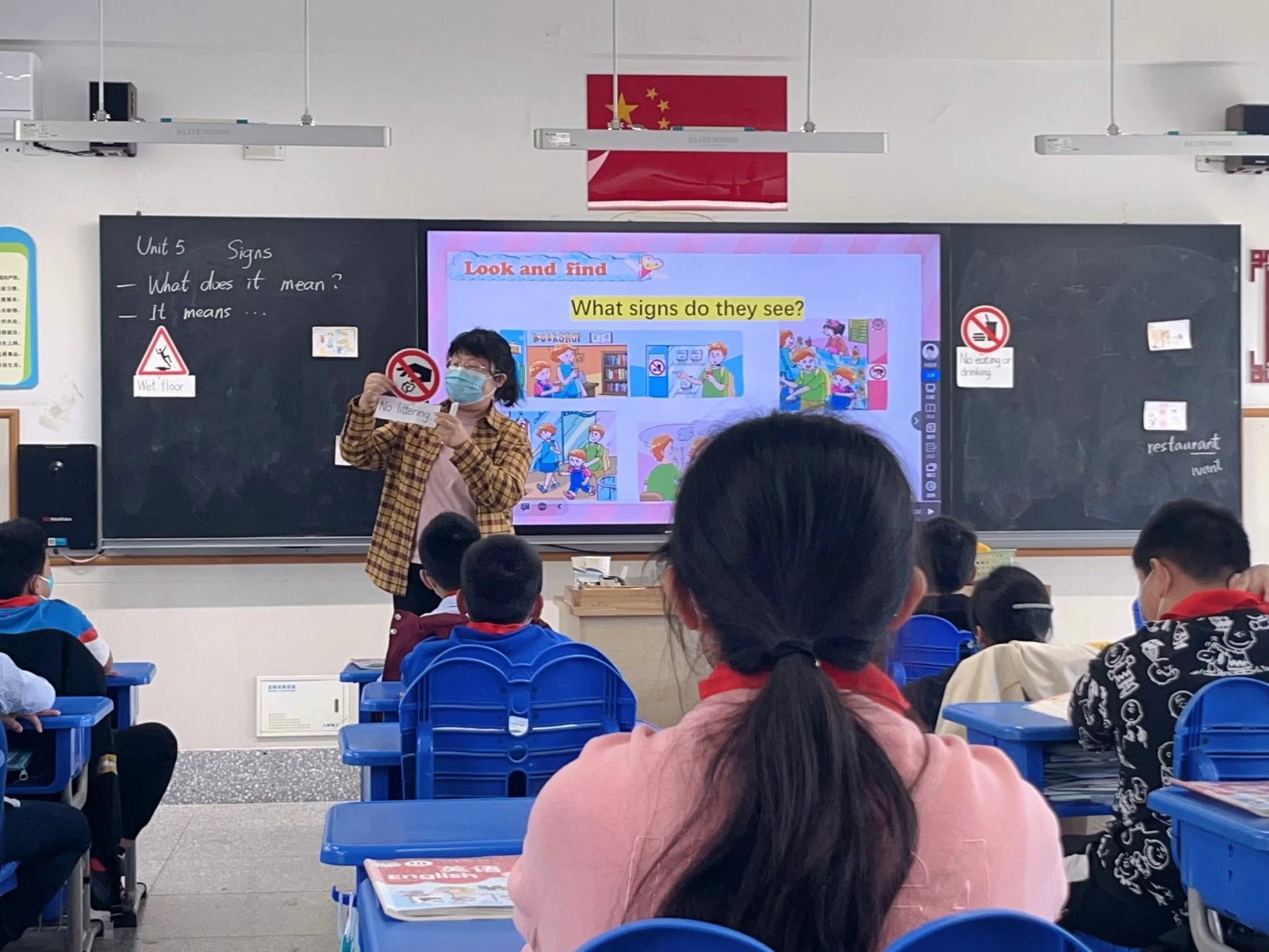 上午第三节课,仲小燕老师带来课例六上Unit 5 Signs Story time。仲老师通过生活中的标识图片引入课题,并引导学生思考哪些地方可以看到这些标识。阅读环节,仲老师通过一系列问题帮助学生理清文本内容。她先带领学生观看视频,提问:Where do they see the signs?让学生找出四个地点。 接着通过呈现书上四幅图片,提问:What signs do they see?引导学生掌握四个标志的名称。最后,仲老师要求学生读文本,提问:What do they mean?引导学生掌握每个标志的意义。读后活动中,仲老师提问:Why do we have these signs? 引发学生思考,从而进一步加深对主题意义的理解,即Signs are everywhere. Signs are useful. Look at the signs and know them well。这节课,仲老师关注文本背后的隐含信息,问题设计层层推进,有效提升了学生的思维品质。