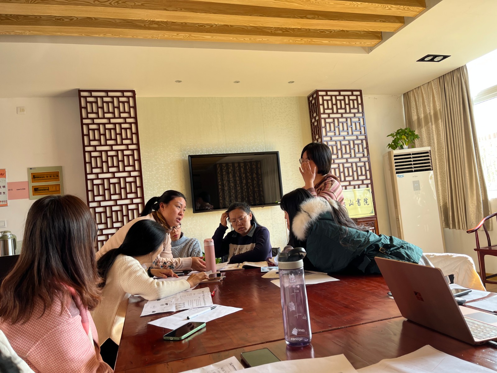 之后,老师们在书院就王雯倩老师的课例围绕主题展开研讨。王老师先阐述了自己的教学思路,每位老师都积极发表自己对“双减”背景下Story time教学有效设计的看法。