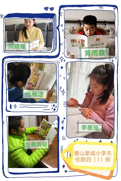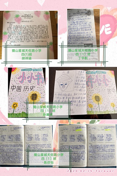 此时此刻虽不能和学生们相聚在同一间教室,但是看到他们一个个积极向上,努力奋斗的样子,内心多了些许感动。寒假前就发了四年级必读书目《写给儿童的中国历史》,从家长们的反馈声中可知,阅读给学生们的生活记录了许多快乐的时光,有的同学选择以读书小报的方式来表达,有的同学选择以制作书签的方式来记忆,有的同学选择以写信的方式来记录……形式尽管不拘一格,创作方式也尤为新颖,但是他们能坚持阅读,乐于阅读,这种品质难能可贵。