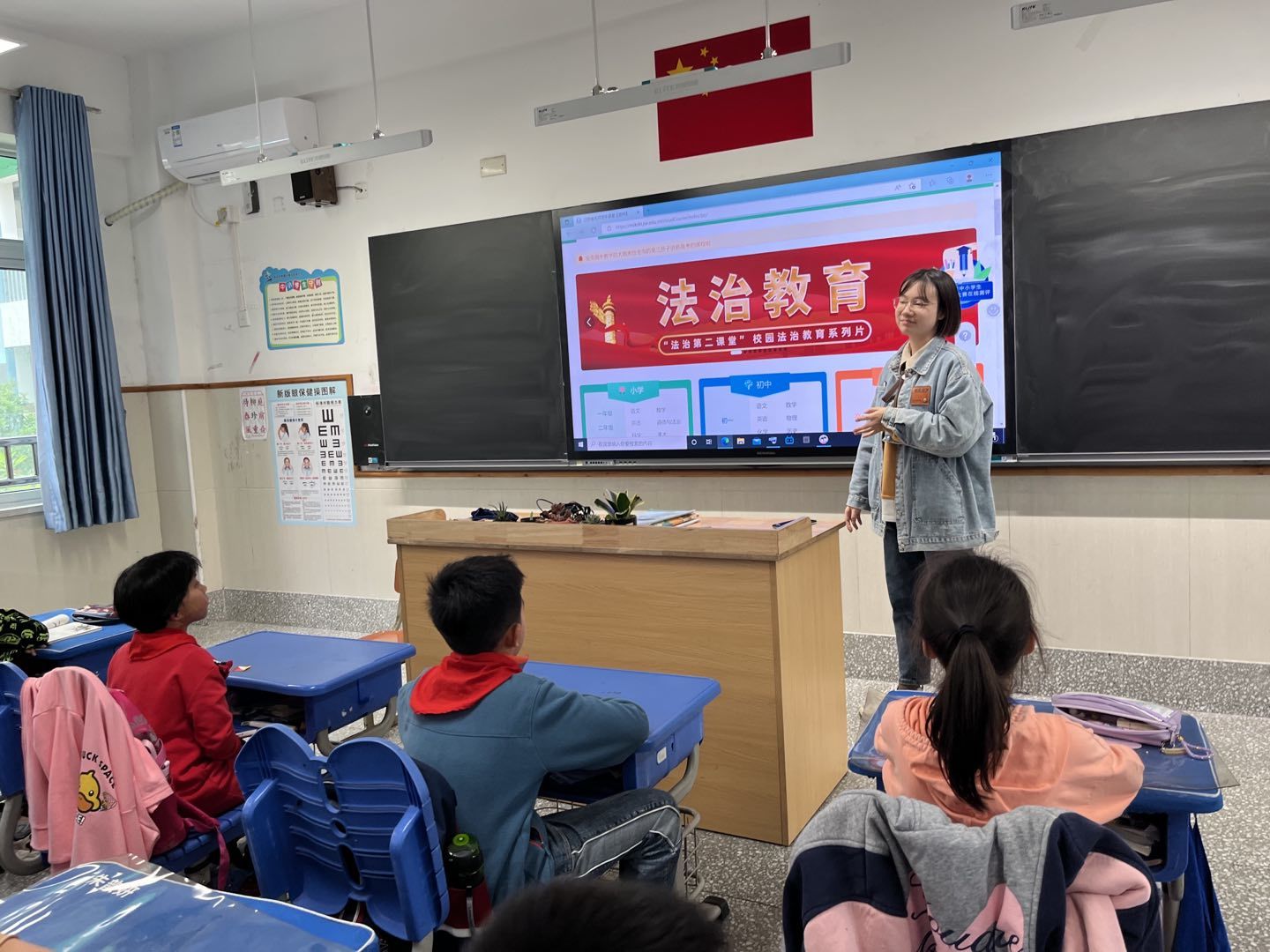 校园内,通过升旗仪式、广播和午会时间,由学校德育处组织,在班主任的大力推动下,开展法治宣传教育,广大学生的法制观念进一步提高,遵纪守法观念,权利义务观念开始树立。午会课时间,组织学生认真学习了江苏城市频道《法治第二课堂》,其中学生学习了《中华人民共和国宪法》、《中华人民共和国刑法》 、《中华人民共和国未成年人保护法》和《道路交通安全法》等法律、法规。通过情景剧使学生了解了我国已步入法制化轨道,我们要自觉地用法律法规来约束自己、保护自己。通过学校法制教育,学生的法制观念进一步提高,遵纪守法观念,权利义务观念开始树立。