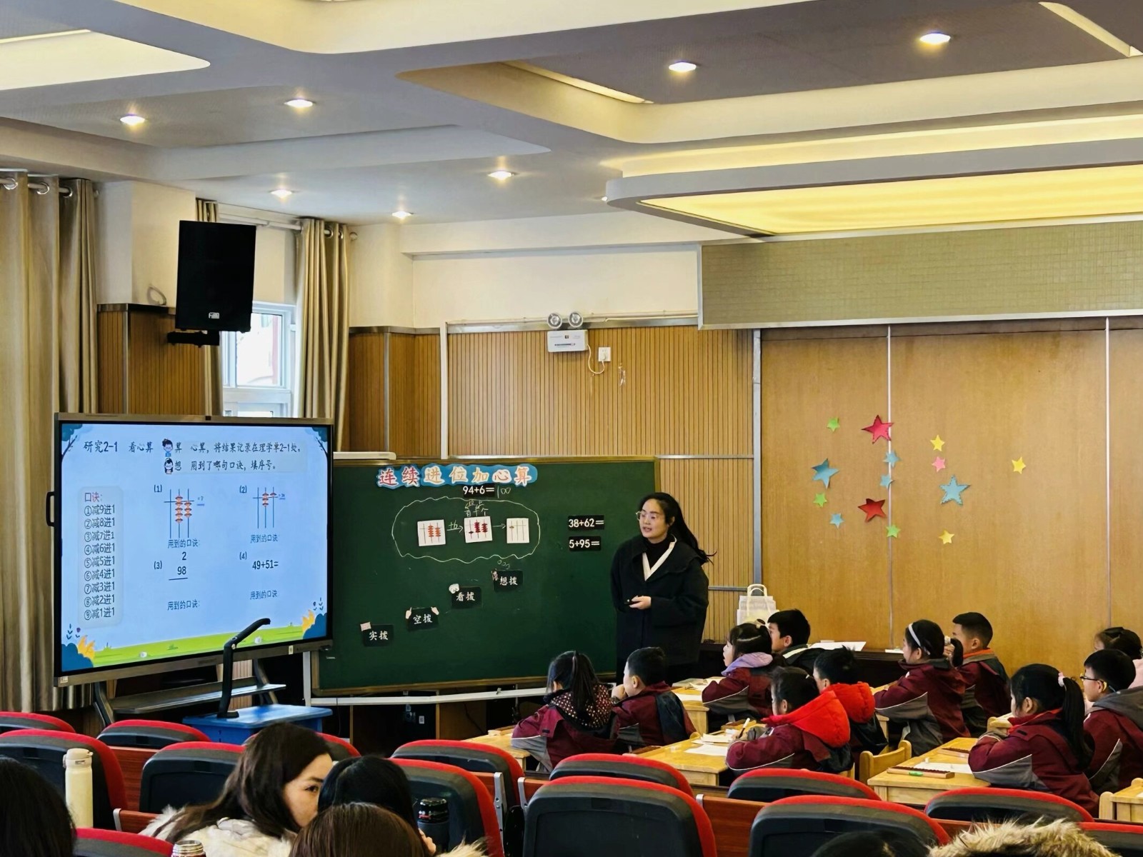 第三节课南湾营小学何骞老师带来《进位加心算(3)》。何老师以“庆祝新年”的故事导入,烟花、爆竹等出现使基本功训练更有趣。整节课以实拨、空拨为学习生长点,围绕珠像图和拨珠过程开展画图、交流心算过程等活动,学生在层层递进的心算中锻炼思维。